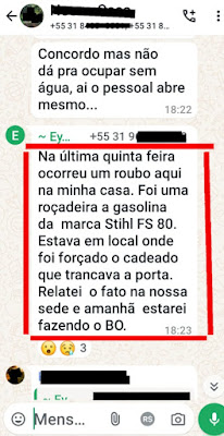 Mais um proprietário relata em aplicativo de mensagens que sua propriedade foi furtada (imagem abaixo). O furto ocorreu no final do mês de agosto. Como temos divulgado há tempos, o número de furtos vem aumentando a cada dia no bairro.